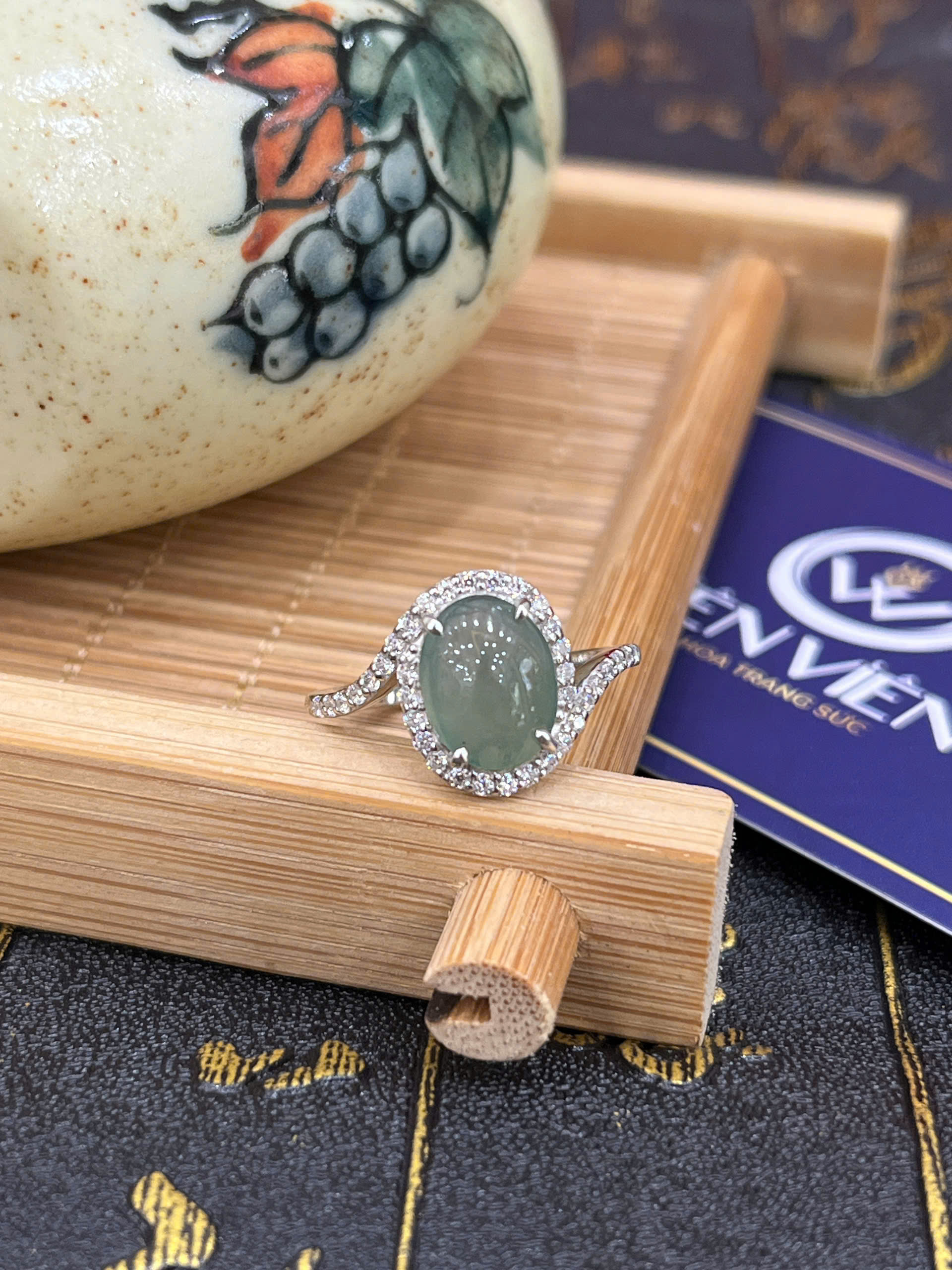 Nhẫn bạc ngọc phỉ thuý trứng cút viền full đá-NP075